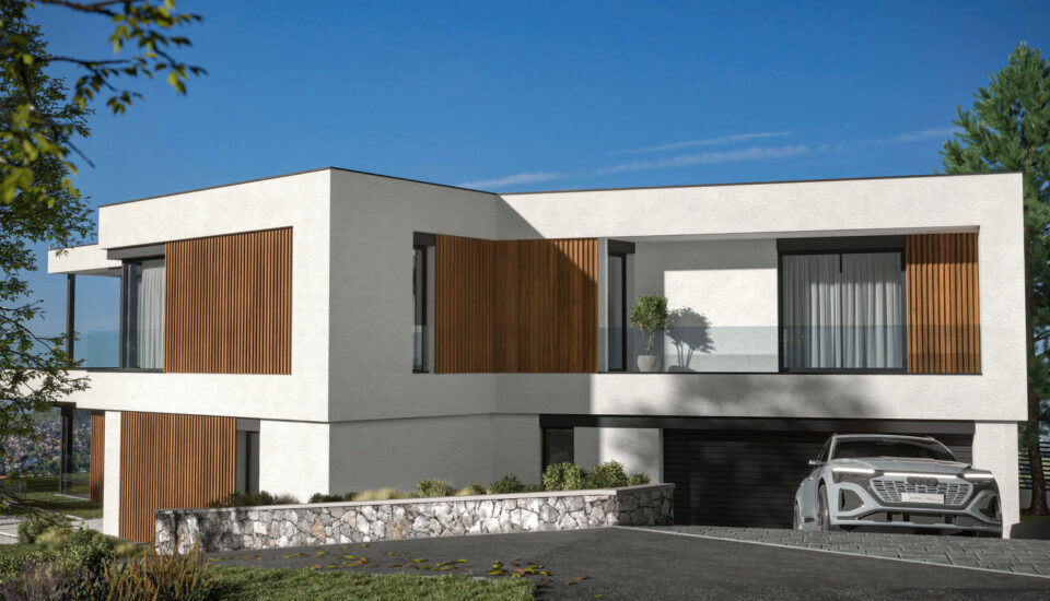A tervezett épület pince + földszint + emelet kialakítású. Az alaprajzot úgy terveztük, hogy a külön szinteket külön lakrészként is lehessen használni. A kert irányába minden szinten nagy méretű ablakokat terveztünk, hogy a hegyvidéki kilátás maximálisan élvezhető legyen. Az emelet teraszt és a kocsibeálló fölé pergola került. A szinteket üvegezett lépcsőház köti össze, benne reprezentatív acélszerkezetű lépcsővel, ezzel is növelve a lakás eleganciáját. Az épület lapostetős, ahova a lépcsőházból közvetlenül fel lehet menni, így a tetőt teraszként lehet használni.