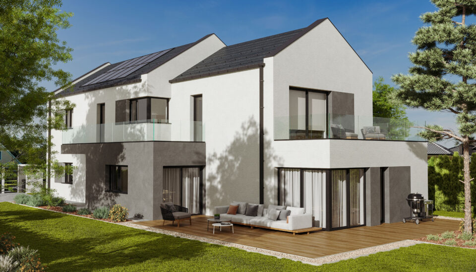 Az új épület a szomszéd beépítéshez igazodva földszint + emelet kialakítású. A földszinten és az emeleten a helyiségeket úgy alakítunk ki, hogy mindkét szinten létrejöjjön nappali-étkező-konyha és hozzá tartozó szobák, így egy lakáson belül külön élettereket hozunk létre a család különböző életkorú tagjai számára.